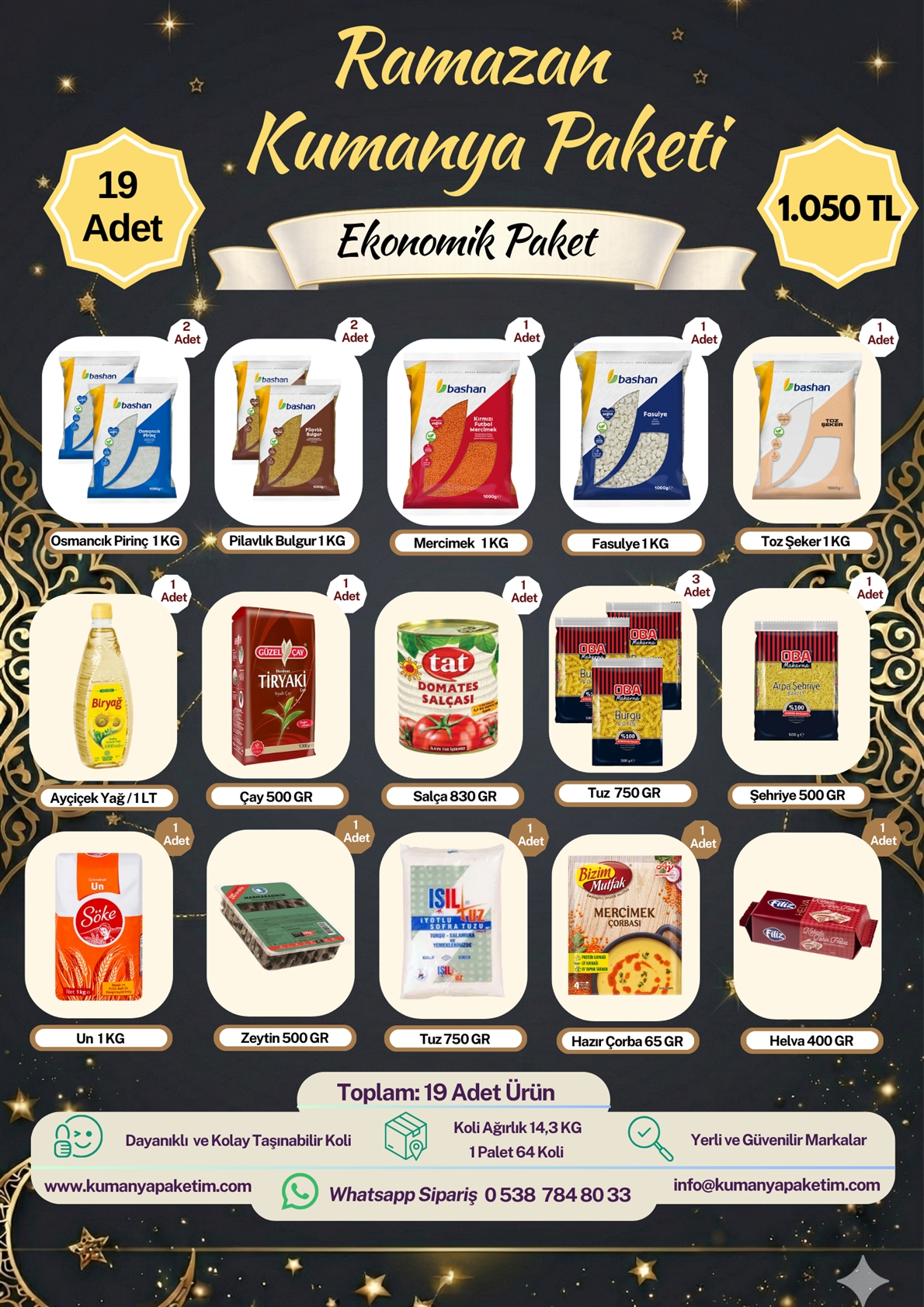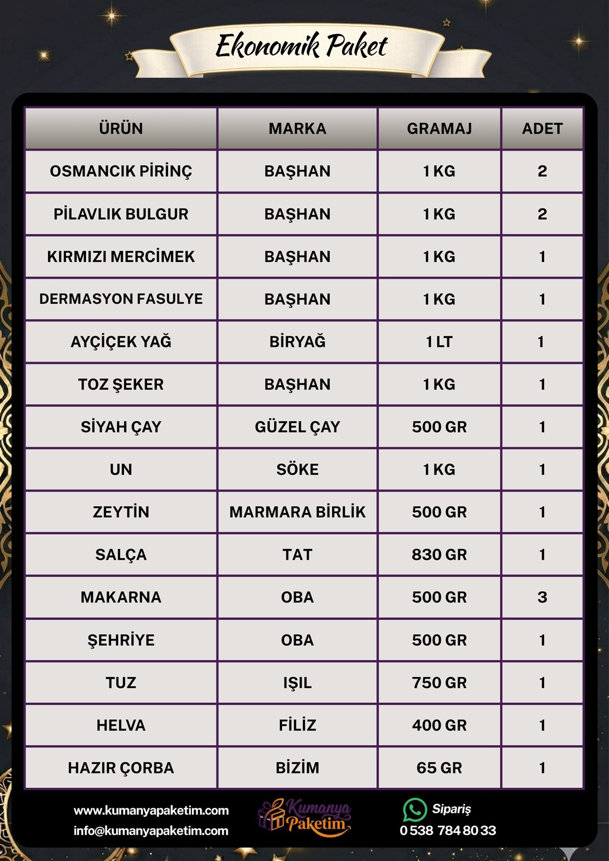 Ekonomik Paket, günlük ihtiyaçları karşılayacak şekilde özenle hazırlanmış, doyurucu ve dengeli bir kumanya seçeneğidir. İçeriğinde yer alan ürünler tazelik ve hijyen standartları gözetilerek seçilir. Hem bireysel hem de toplu kullanımlar için ideal bir yapı sunar. Uygun fiyatlı olmasıyla bütçe dostu bir çözüm sağlar.