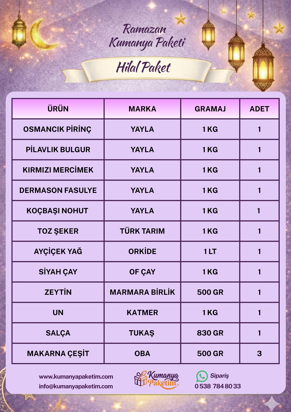 Hilal Paket, günlük ihtiyaçları karşılayacak şekilde özenle hazırlanmış, doyurucu ve dengeli bir kumanya seçeneğidir. İçeriğinde yer alan ürünler tazelik ve hijyen standartları gözetilerek seçilir. Hem bireysel hem de toplu kullanımlar için ideal bir yapı sunar. Uygun fiyatlı olmasıyla bütçe dostu bir çözüm sağlar.