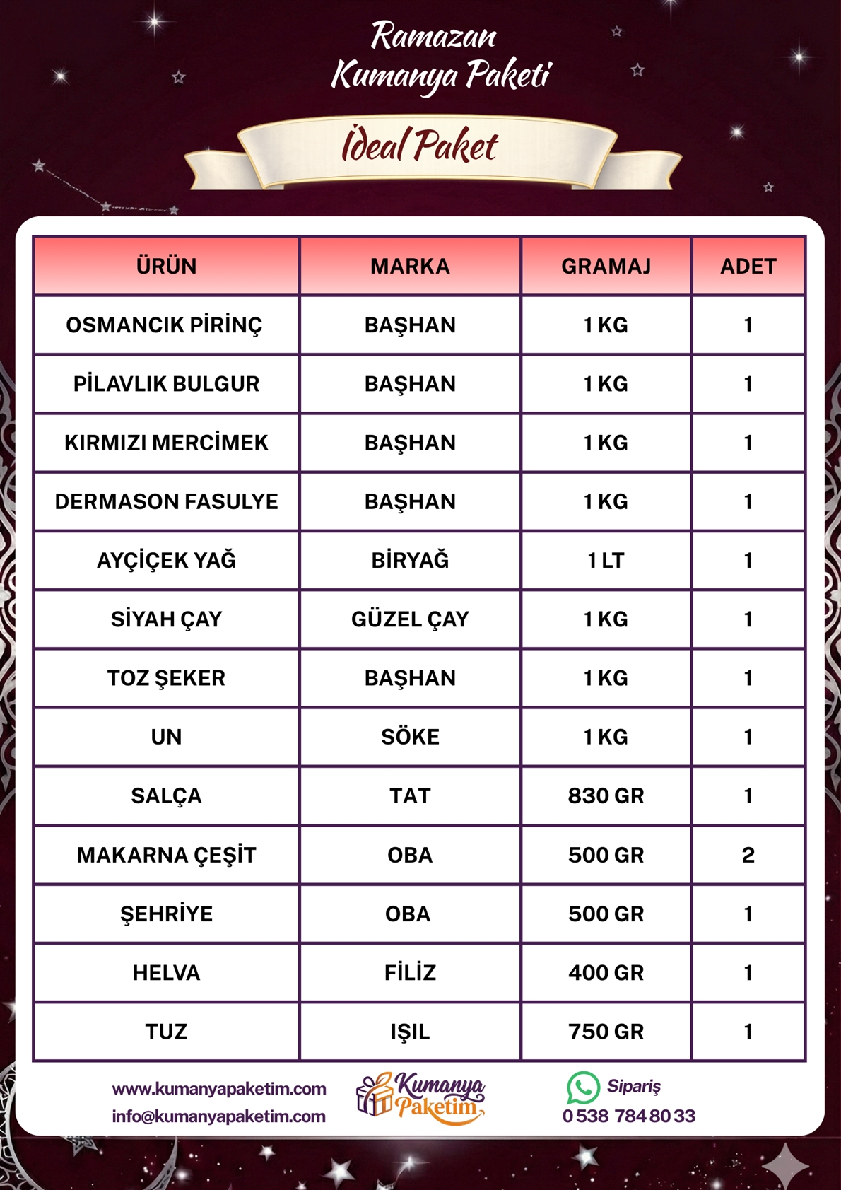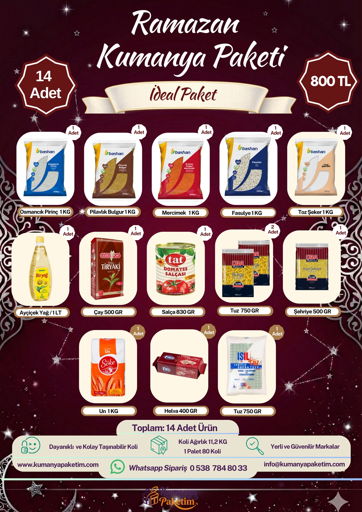 İdeal Paket, günlük ihtiyaçları karşılayacak şekilde özenle hazırlanmış, doyurucu ve dengeli bir kumanya seçeneğidir. İçeriğinde yer alan ürünler tazelik ve hijyen standartları gözetilerek seçilir. Hem bireysel hem de toplu kullanımlar için ideal bir yapı sunar. Uygun fiyatlı olmasıyla bütçe dostu bir çözüm sağlar.