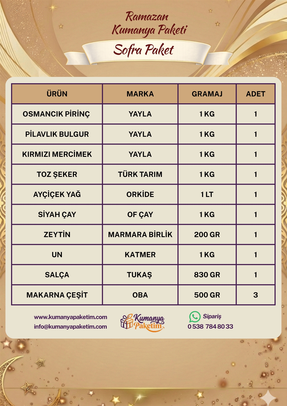Sofra Paket, günlük ihtiyaçları karşılayacak şekilde özenle hazırlanmış, doyurucu ve dengeli bir kumanya seçeneğidir. İçeriğinde yer alan ürünler tazelik ve hijyen standartları gözetilerek seçilir. Hem bireysel hem de toplu kullanımlar için ideal bir yapı sunar. Uygun fiyatlı olmasıyla bütçe dostu bir çözüm sağlar.